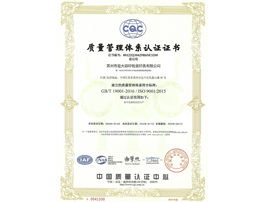 質量(liang)管理體系認(rèn)證證書